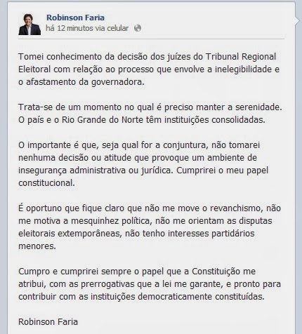 O “ainda” vice-governador do Rio Grande do Norte emitiu sua opinião sobre o afastamento da governadora Rosalba Ciarlini na noite desta segunda-feira, 10 de dezembro, via Facebook.